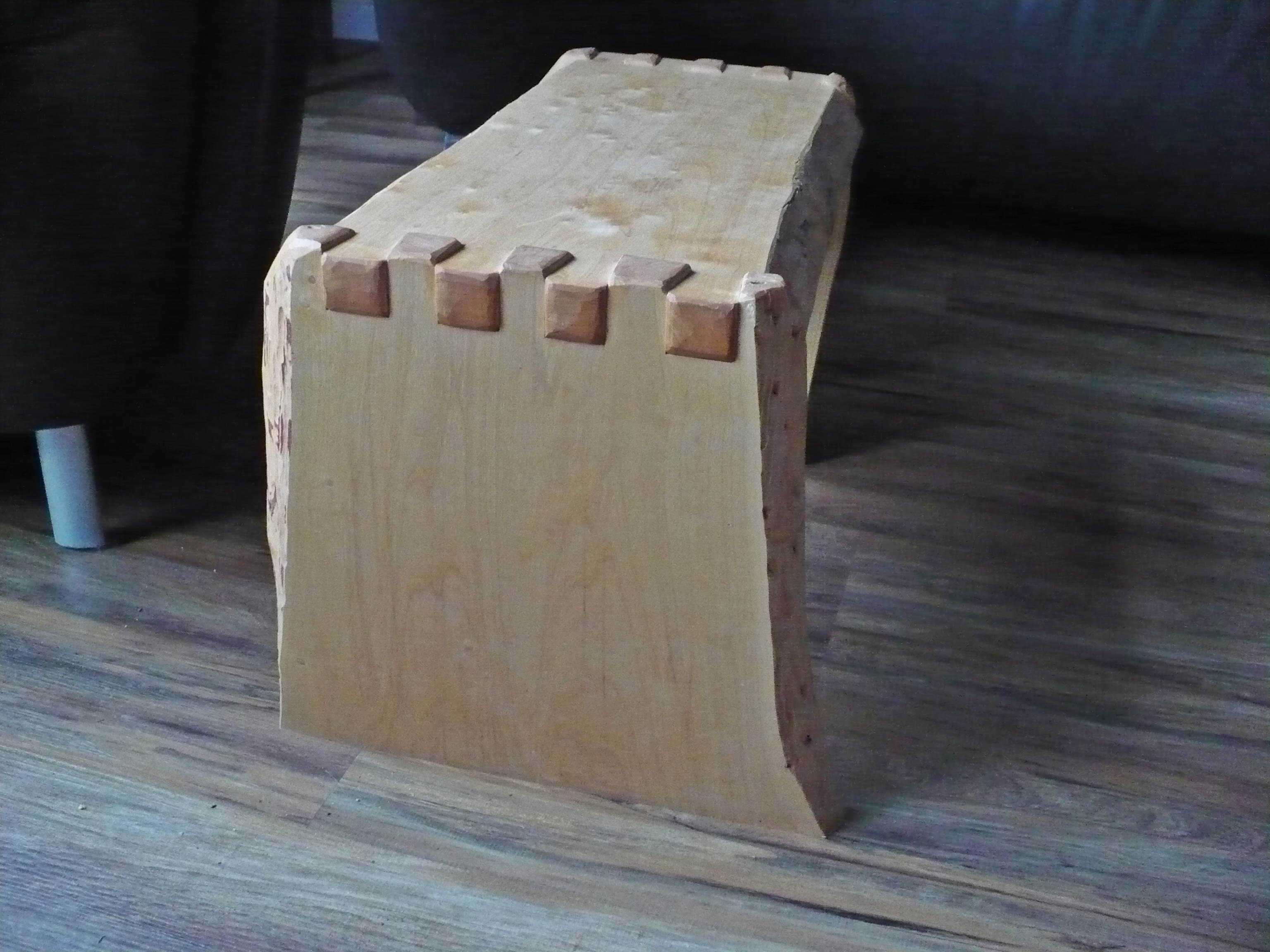 Maden haben das Birkenholz unter der Rinde bearbeitet. Der Hocker würde seinen Charme verlieren, wenn man das Brett besäumt und die Naturkante entfernt.