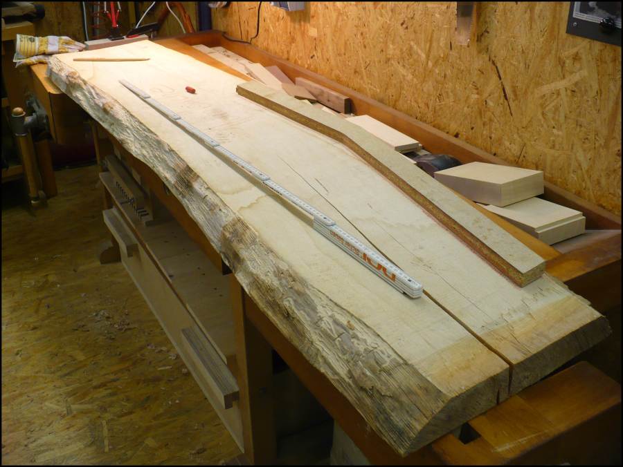 60 mm Haibuchenbohle. Mit einer Schablone werden die Umrisse für die Halterungen aufgezeichnet