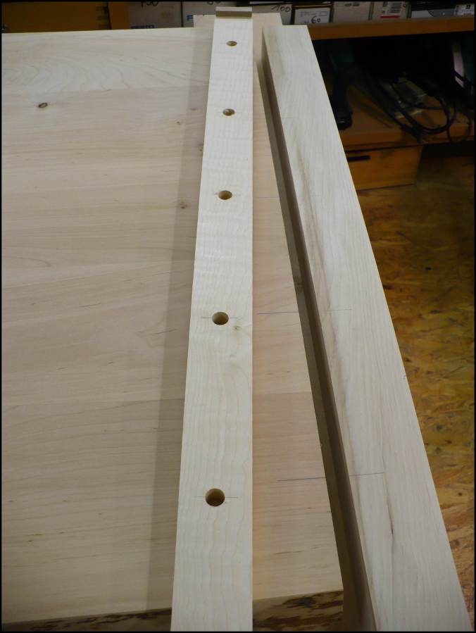 Durch die Holzleiste habe ich 12mm Löcher gebohrt. Es sollen 12 mm Buchendübel verwendet werden.
