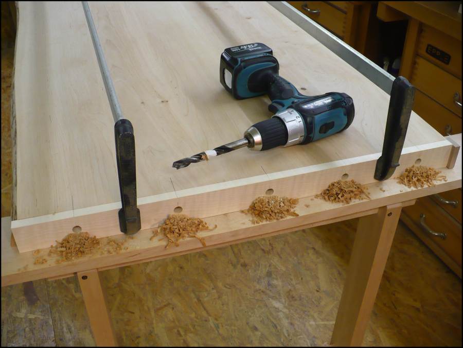 Die Holzleiste wird mit Schraubzwingen an der Tischplatte fixiert und durch die vorgebohrten Löcher werden die Dübellöcher gebohrt. Am Gegenstück bohrt man die Löcher natürlich von der anderen Seite.