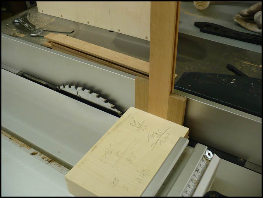 Auf einem dicken Hartholzabfallstück habe ich 2 kleine Leisten aufgeleimt, zwische die ich die Rahmenleiste senkrecht stellen kann. Mit dieser Vorrichtung kann man sicher die Leiste gehen den Parallelanschlag drücken und über das Kreissägeblatt schieben.