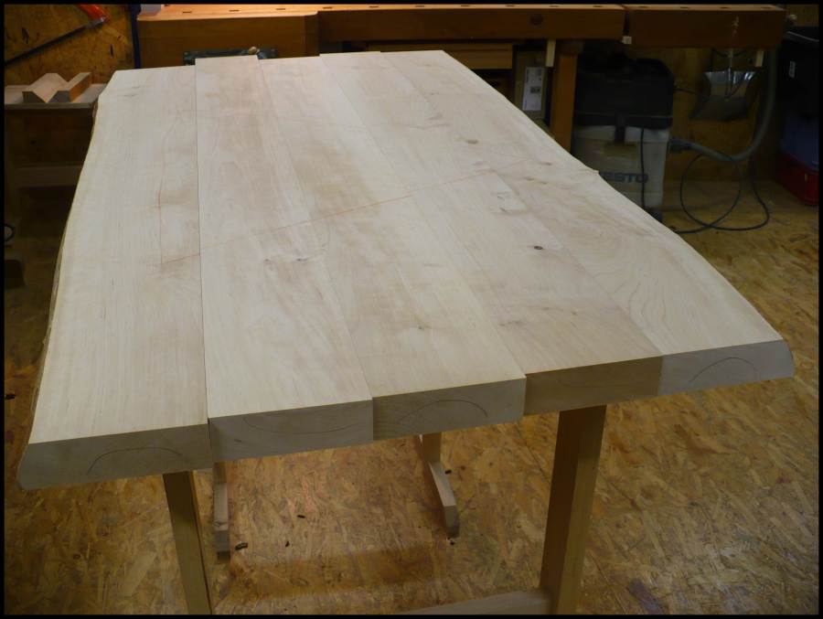 Die Bohlen wurden für die Tischplatte in die spätere Reihenfolge gebracht.