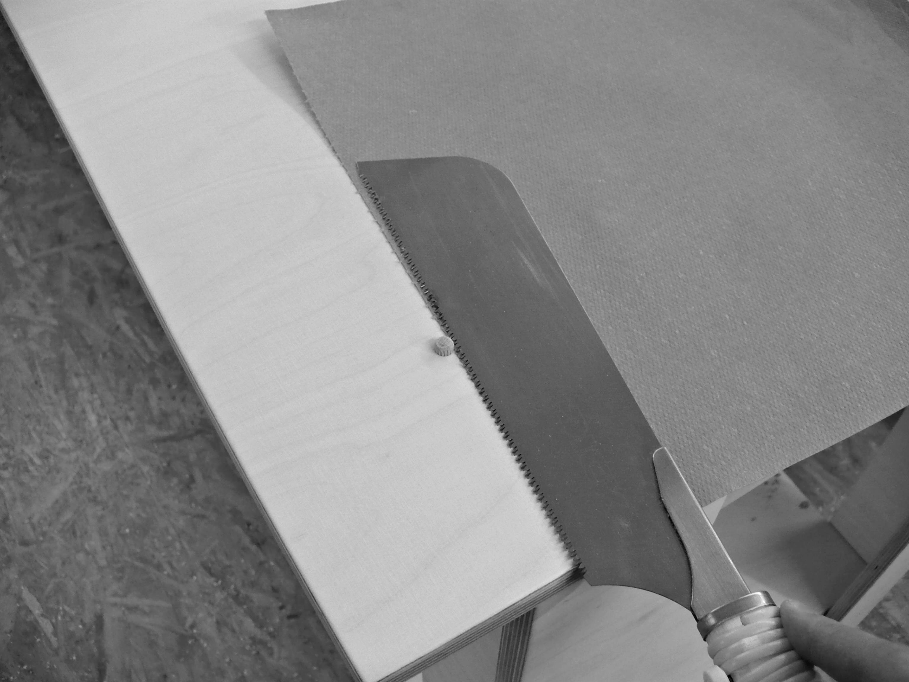 Die überstehenden Dübel werde abgesägt. Ich lege ein Papierflies (z.B. Küchenrolle unter, so wird die Oberfläche nicht zerkratzt