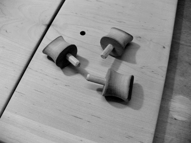 Mit Holzdübeln werden die Griffe in die Schubladenfronten geklebt