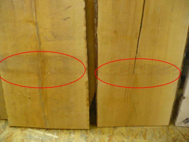 Hier auf den Erlenbrettern sehr schön zu erkennen die Lagerung auf einer normalen Stapelleiste (links) und auf einer schräggefrästen Stapelleiste (rechts)