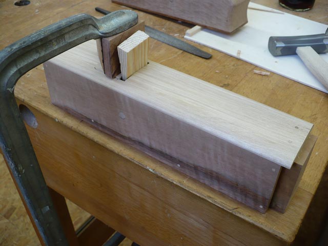 Beim Einleimen verhindert man mit einem Keil, dass das Inlay verrutscht
