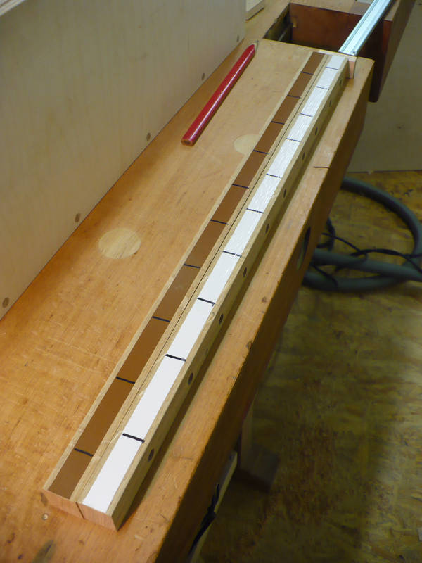 Da auf gleicher Höhe von beiden Seiten liegende Bretter in die Seitenteile eingedübelt werden sollen, habe ich 2 Schablonen mit versetzten Lochreihen erstellt. Somit trifft nicht Dübel auf Dübel!