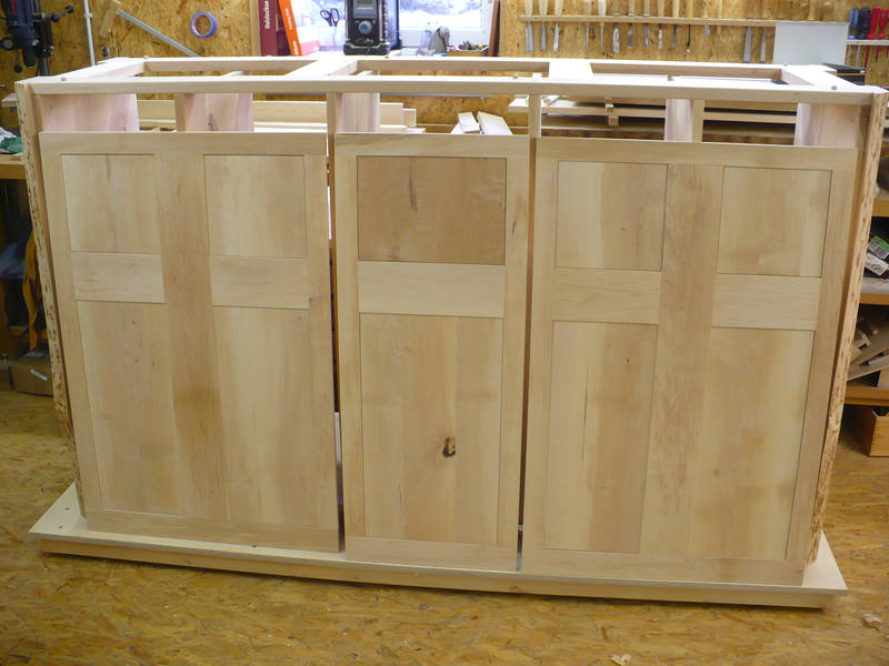 20140908 029Es sind zwar nur Rückwände, aber ich habe auch hier Wert darauf gelegt, dass eine durchgehende Zeichnung der Füllungen gegeben ist. Mit Ausnahme der mittleren Rückwand. Hier ist später nur der obere Bereich zu sehen. Unten ist ein Schubladeblock, da wird man nicht auf die Rückwand sehen können.