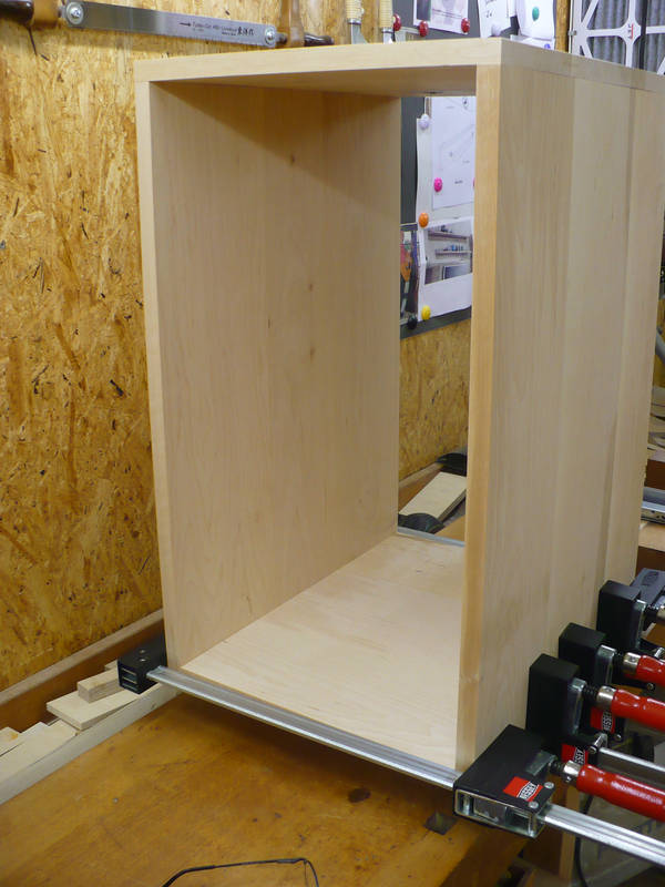 Spätestens jetzt hat es sich gelohnt, dass alle bisherigen Arbeiten mit absoluter Genauigkeit ausgeführt wurden. Alle Abstände waren gleich groß und alle Schrankelemente stehen genau im rechten Winkel. Somit konnte der Korpus, der die Schubladen aufnehmen wird, problemlos und wieder passgenau hergestellt werden.