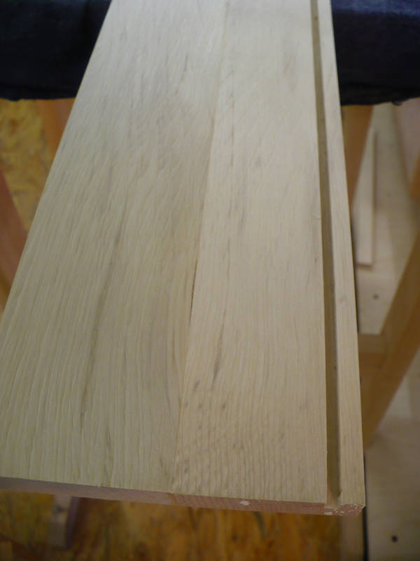 Es hat Vorteile, die Nut noch in die langen Bretter zu fräsen! Beim Fräsen verwackelt man meist am Anfang, wenn noch nicht beide Anschlagbacken der Oberfräse am Brett anliegen. Sind die Bretter noch nicht auf die spätere Länge gekürzt und hat man ein paar cm Verschnitt mit eingeplant, sind die unsauberen „Anfangsstellen“ noch auf dem Abfallstück.