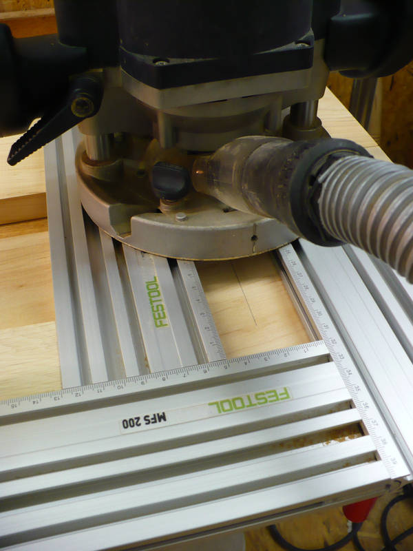 Danach wird eine Schablone aufgelegt – die Oberfräse habe ich mit einer 40 mm Kopierhülse ausgestattet – die Schablone war mit einer Breite von 50 mm eingestellt.
