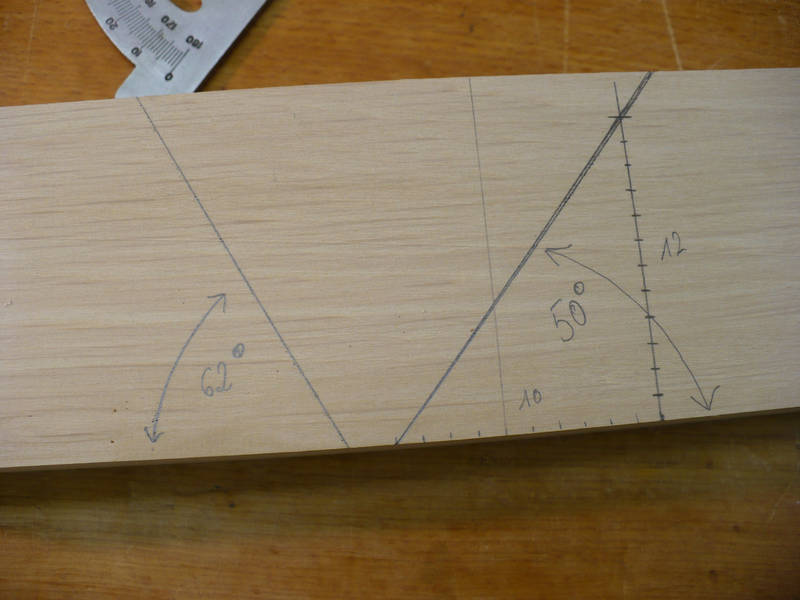 Für das Bett des Hobeleisens habe ich eine 10:12 Teilung gewählt, was einem 50° Winkel entspricht. Vorne beim Spanaustritt habe ich einen Winkel von 62° gewählt