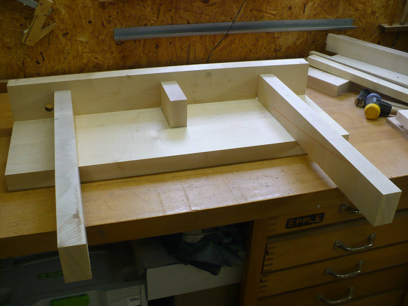 Hier sieht man die Zwischenstreben. Die linke und rechte Strebe geht auf der kompletten Länge durch. Die mittlere Strebe habe ich von der mittleren Kante um 12 cm gekürzt. 12 cm sind nämlich maximal die Schraubzwingen, die ich zum Spannen der Werkstücke verwende. So stoße ich beim Spannen nicht an der mittleren Strebe damit an.