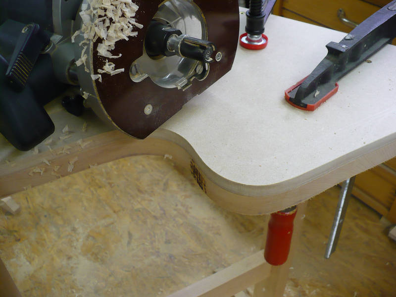 Die Oberfräse habe ich mit einem Schaftfräser mit Anlaufring bestückt und bin die Schablone abgefahren. Die Drehzahl wurde drastisch reduziert um möglichst keine Brandspuren auf dem Stirnholz zu hinterlassen