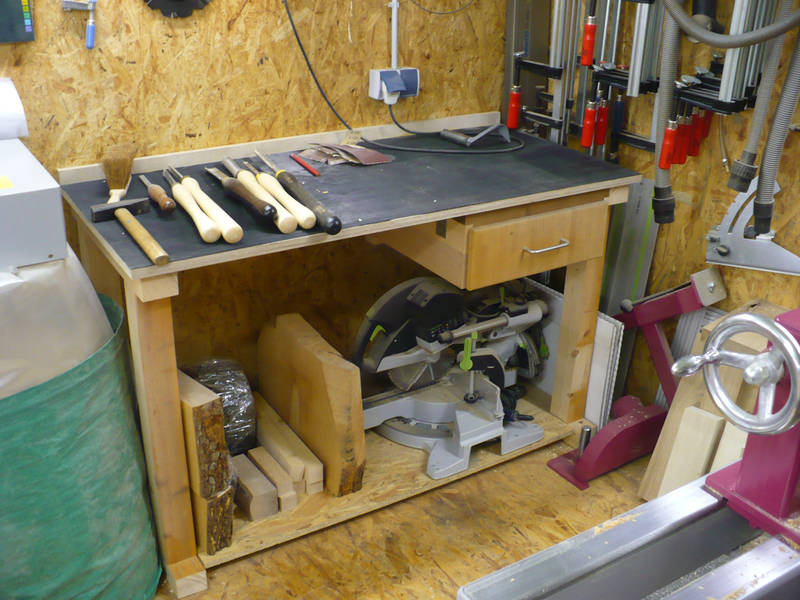 Die Unterschränke habe ich aus Holzresten und Presspanplatten gebaut. In den Schränken sind nun die Maschinen verstaut, die vorher in Systainern unter der Werkbank waren. So konnte ich eine komplette Werkbank wieder leer bekommen.