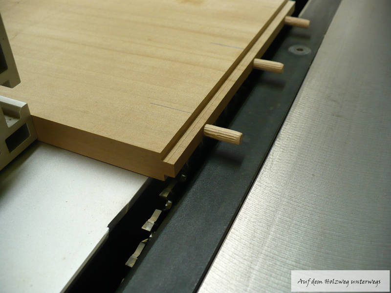 Ein Falz wird an der Kreissäge geschnitten, damit die Querstrebe auch in die Nut der Rahmenteile passt