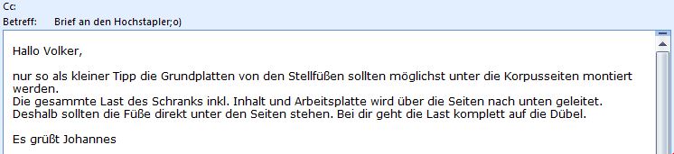 Wenn ich die Bodenplatten der Verstellfüße bei den Unterschränkem an den Seitenrand setze, wie Johannes geschrieben hat, habe ich auch den Druck von der Bodenplatte weg. Also ich glaube schon, dass die Konstruktion so die Bessere ist.