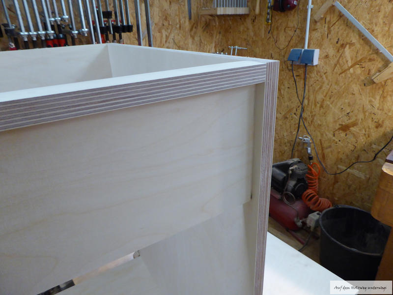 Oben ist der Schrank für die Spüle offen und vorne hat er eine Blende