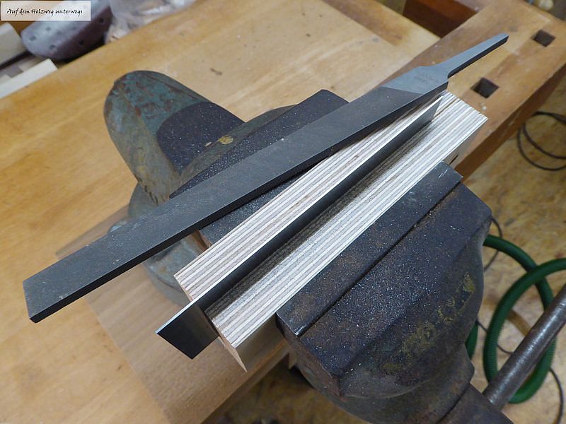 Die Ziehklinge lässt sich so ohne dass sie beschädigt wird in einen Schraubstock (oder die Hobelbank) einspannen.
