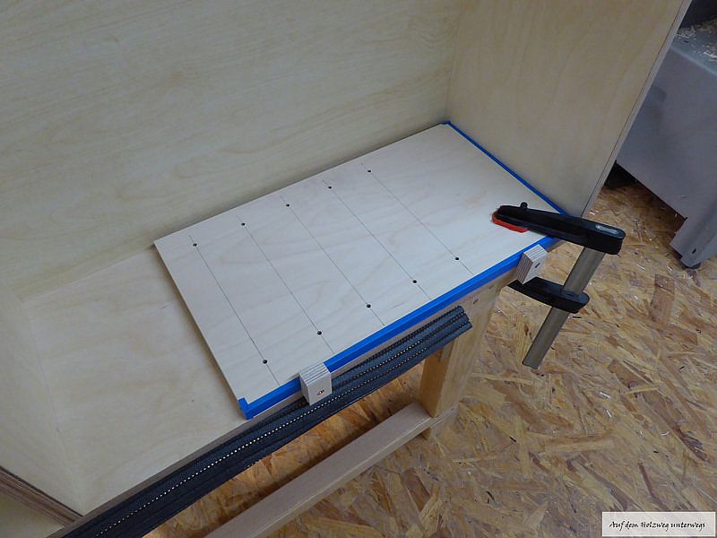 Schablone wird im Korpuss mit einer Zwinge fixiert. Das blaue Klebeband signalisiert mir, wo die Schablone anschlagen muss. Also wo forne und wo unten ist