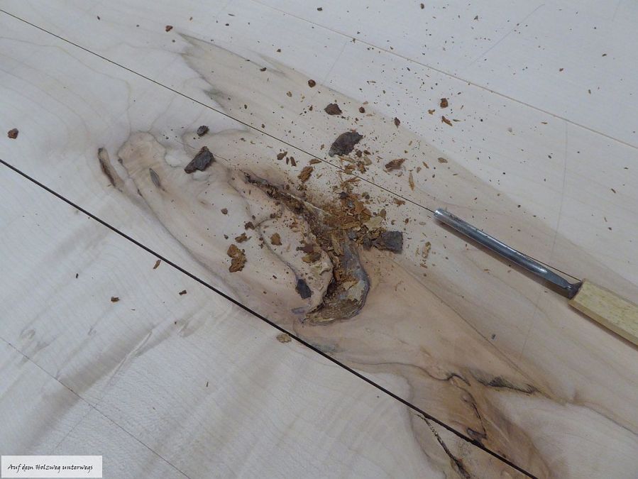 Dir morschen Stellen vom Ast werden entfernt – das Loch geht nicht durch das Brett – gut!