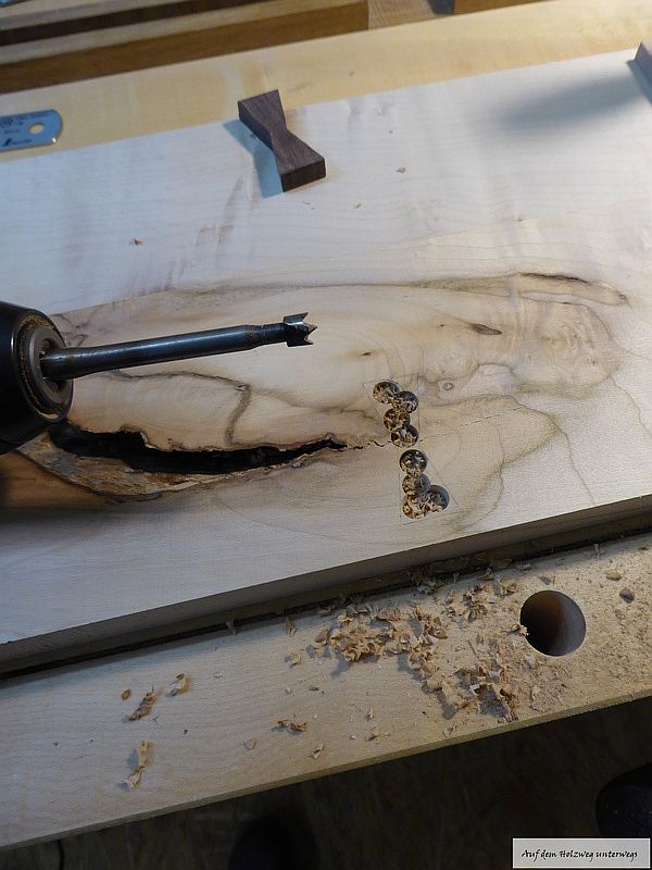 Mit einem kleinen Forstner Bohrer wird innerhalb der Kanten das Material grob entfernt