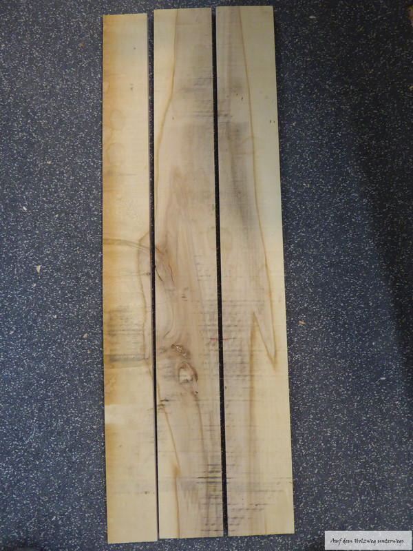 Wem diese 3 Bretter bekannt vorkommen, der hat gut aufgepasst. Hier handelt es sich um die Rückseite genau der Bohle, die ich für die Türe verwendet habe. Da die Bohle an dieser Stelle stark gewölbt war, musste ich für die Türe deutlich mehr als die Hälfte verwenden. Diese Reststücke haben daher nur noch eine Stärke von ca. 16 mm, aber als Füllung für eine Rückwand reicht das locker aus.