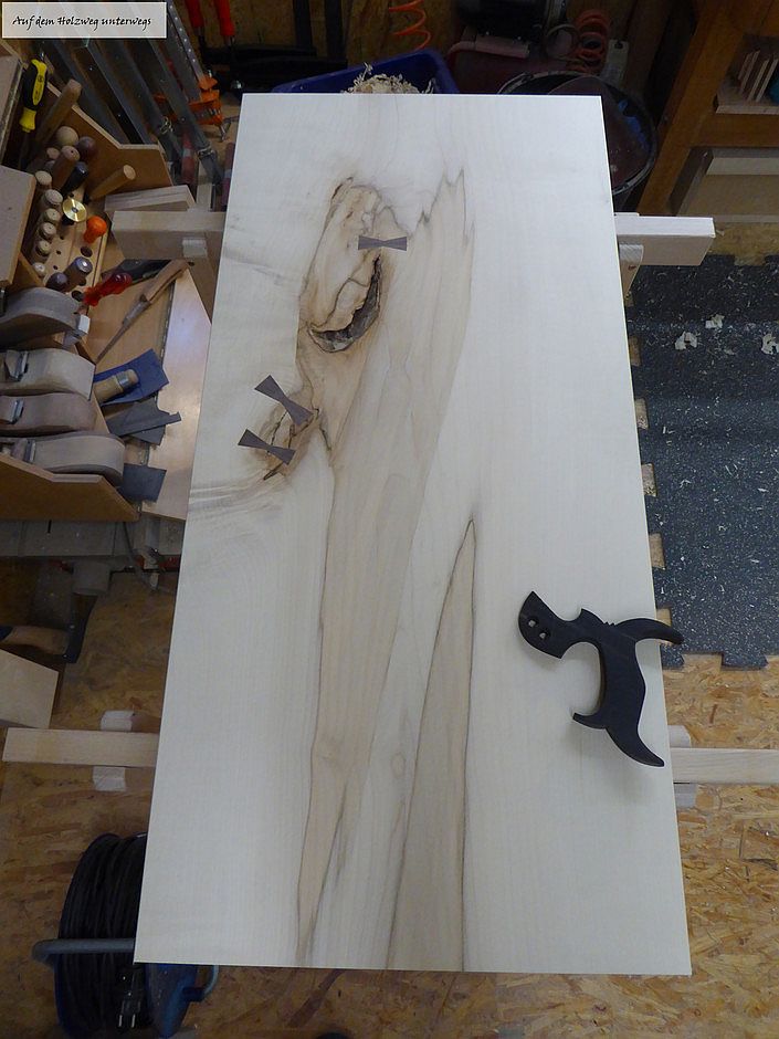 Mein erster Versuch war, die Halterungen für die Sägen aus Nussbaum zu bauen. Nach der ersten Anprobe stellte ich aber die Arbeit ein und suchte mir ein passendes Stück Ahorn. Das passte viel besser zum Gesamtbild des Schrankes.