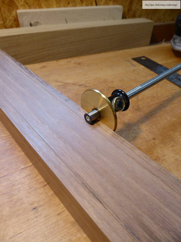 Eine Bohrschablone dür die Küchenkästen entsteht. Die MPX Platten sind 18mm stark. Das bedeitet auf 9mm setze ich die Bohrung. So wird sie mittig.