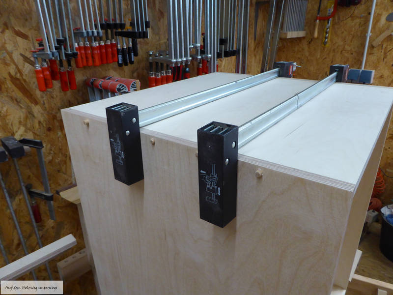 Die Bohrschablonen werden entfernt und 2 Schraubzwingen angesetzt. So treibt es beim Dübel setzen nicht den Leim zwischen die Platten und die Schränke werden dicht.
