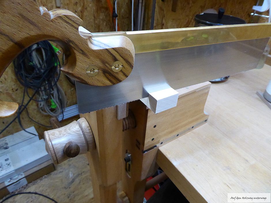 Die Maße für den Zapfen wurden mit dem Streichmaß auf das Holz übertragen und der Zapfen mit der Handsäge ausgesägt. Sägen im Querholz.