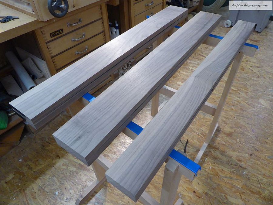 Auch schon vorbereitet die Teile für die Tischplatte und die Längszarge.