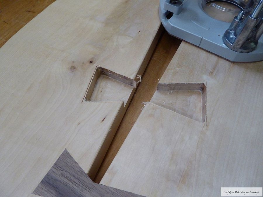 Nach dem Anzeichnen mit dem Messer habe ich in mehreren Etappen mit der Oberfräse und einem 5mm Fräser das Holz bis nach an den Anriss entfernt