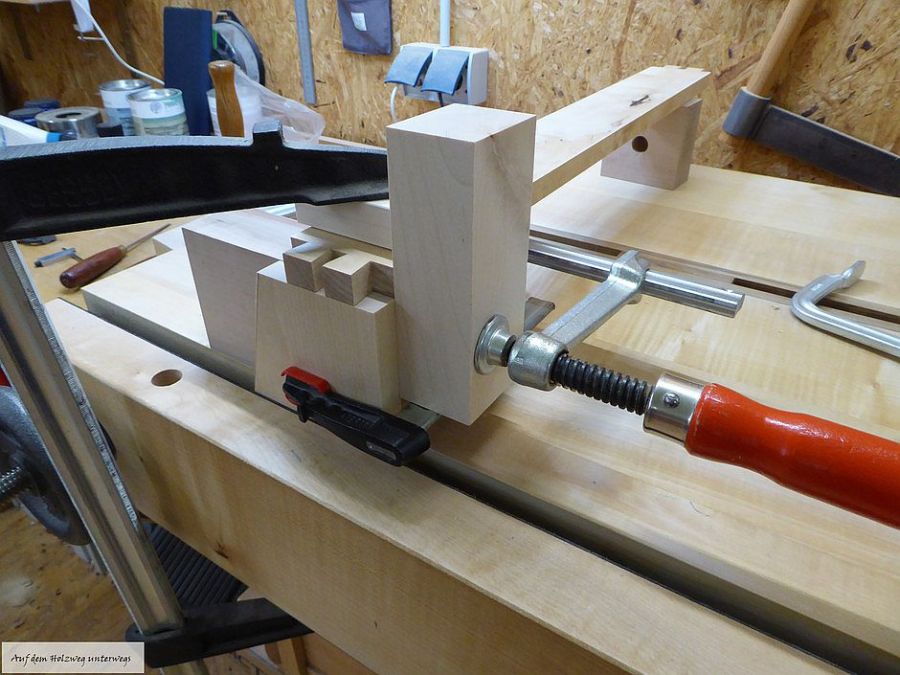 Wilde Konstruktionen sind notwendig um die Schwalben auf das Zinkenbrett zu fixieren. So kann dann verrutschsicher angerissen werden