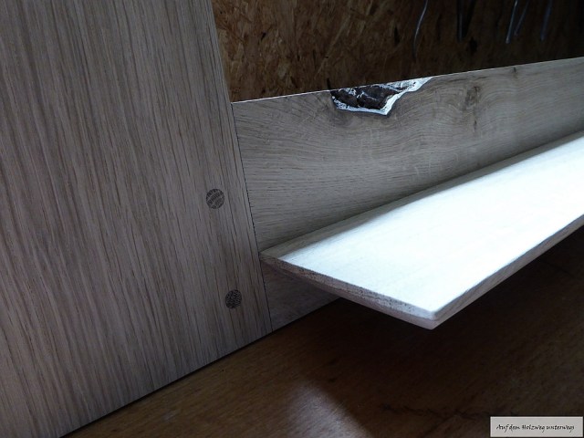 Der Waschtisch klappt ja ein paar mal 90° ums Eck. Dafür habe ich die entsprechenden Gehrungen geschnitten und entsprechende Dübellöcher  gefräst.
