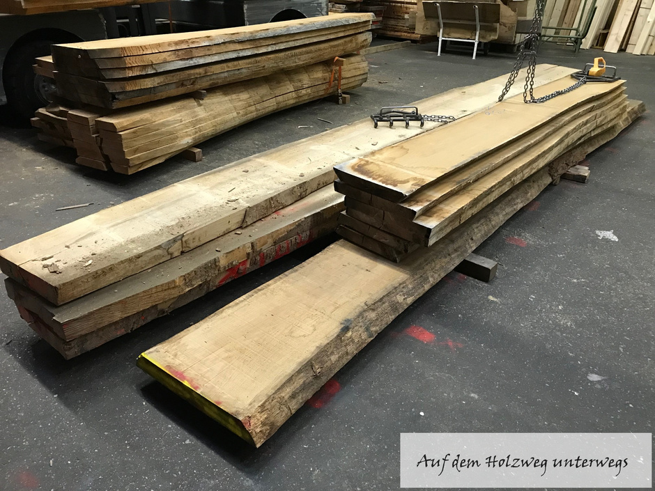 Neben den Beschlägen, dem richtigen Werkzeug und einer stattlichen Anzahl schwerer Schraubzwingen benötigt man dann nur noch das Holz. Mitte November 2017 war ich bei meinem Händler und hatte das Eichenholz für die Hüttenfenster besorgt. Bei dieser Gelegenheit habe ich 3 Ahornbohlen 80 mm stark und ca. 5 Meter lang mit ausgesucht.