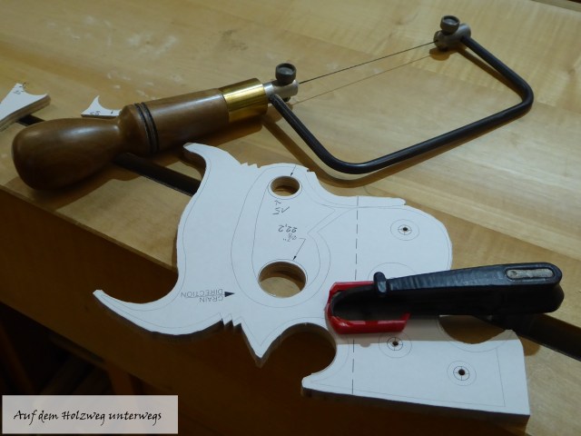 Beim Sägegriff habe ich mich an einer Vorlage von Wheeler-Maden & Clemson orientiert. Erst eine Schablone aus Sperrholz ausgesägt um später die Konturen auf das Olivenholz zu übertragen.