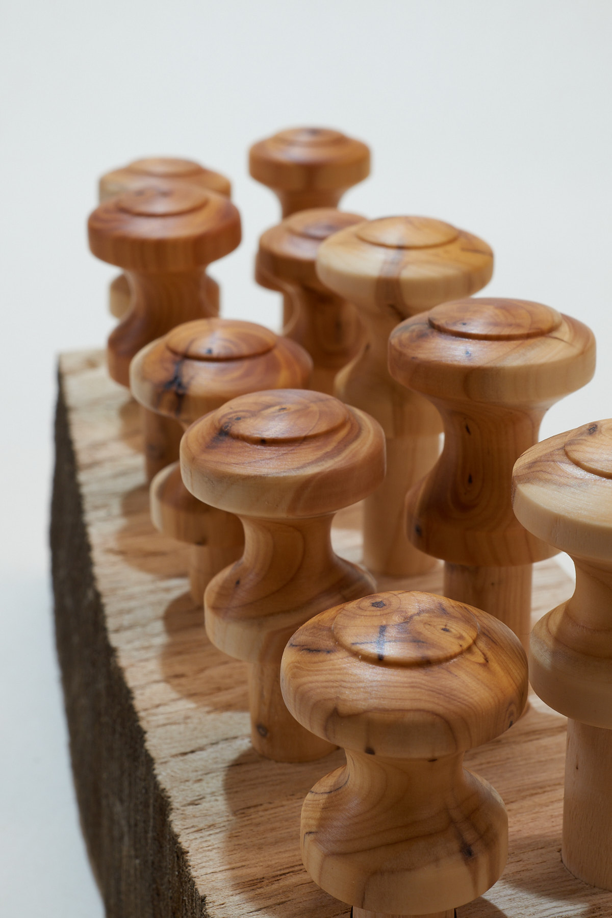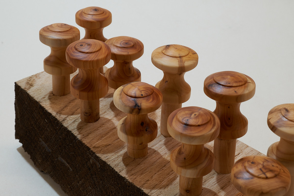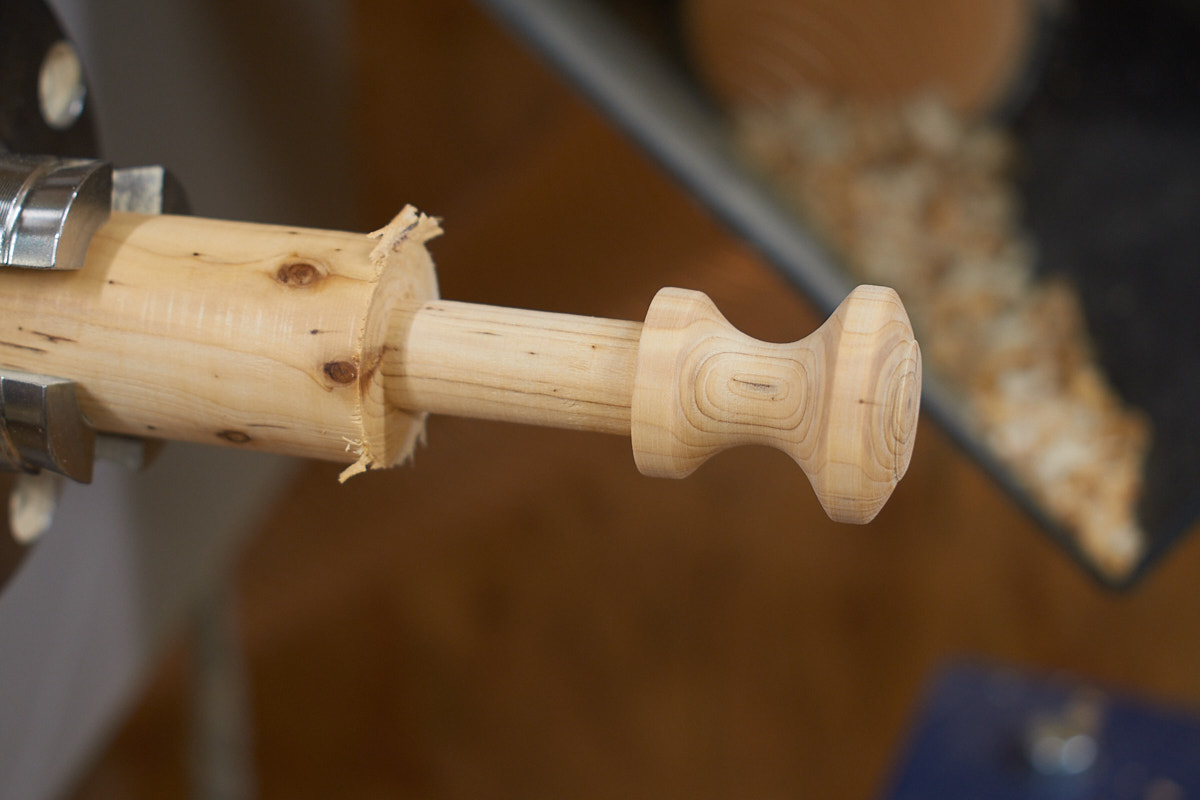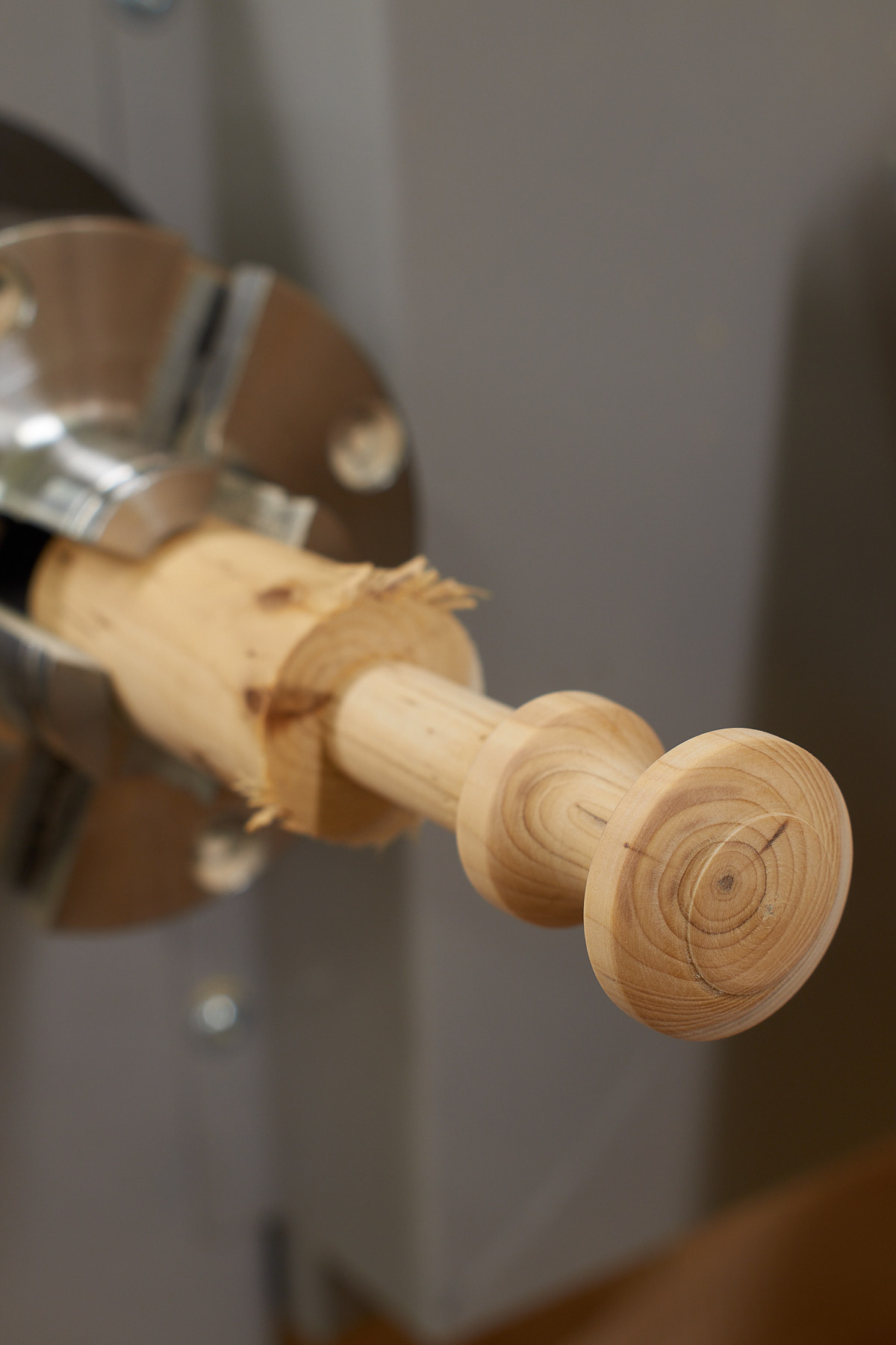 Aus der dünneren Eibe habe ich zunächst Rundstäbe mit 27mm gedrechselt. Aus einem Rundstab konnten dann 2 Knöpfe (30mm Griff + 30mm Zapfen) geformt werden. Die entsprechenden Maße, die Absätze und Rundungen prägen sich rasch ins Gedächtnis ein und werden zur Routine.