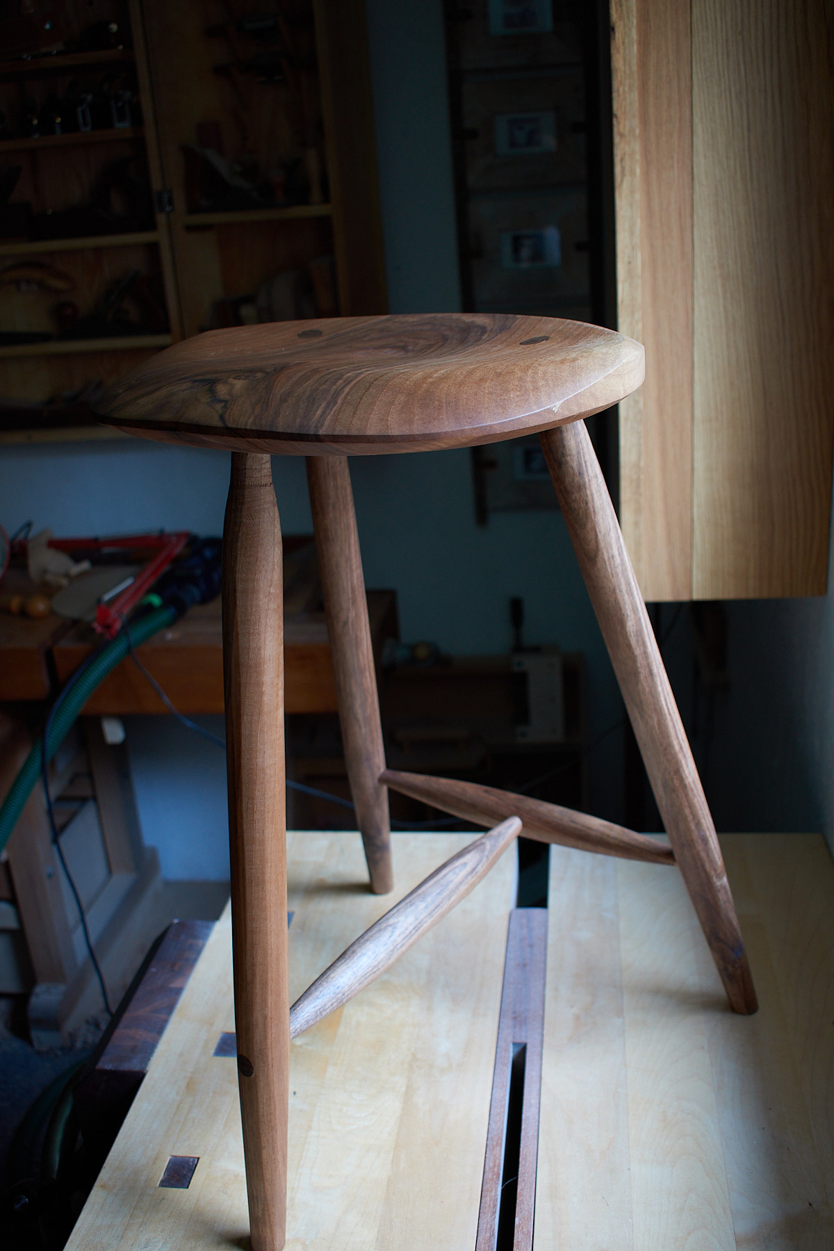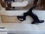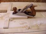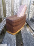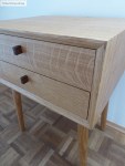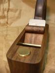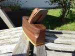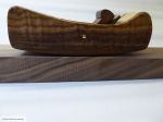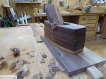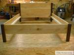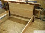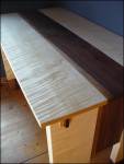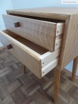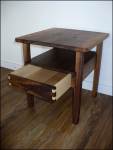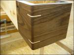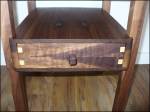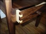 Die Ahorn-Seitenteile des Nachkästchens wurden mit gestemmten Schwalbenschwanzzinken verbunden. Die Schublade ist aus Ahorn, die Schubladenfront aus Nussbaum. Die Schubladenseiten hab ich mit halbverdeckten Schwalbenschwanzzinken mit der Front verbunden.