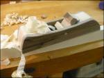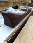 Das Mittelstück der Schreibtischplatte habe ich funiert. Mit der Bandsäge habe ich 9 cm breite und 8 mm starke Eichenbretter gesägt und auf 5 – 6 mm gehobelt. Diese Eichenbretter habe ich dann geräuchert. Danach wurden sie auf eine 21mm Multiplexplatte aufgezogen. Somit konnte man das Mittelteil wunderbar mit Dominodübel in die helle Platte (die ist massiv) integrieren.
